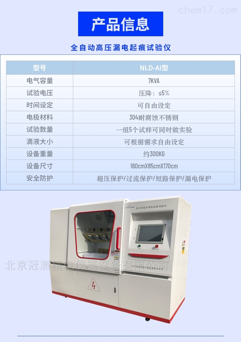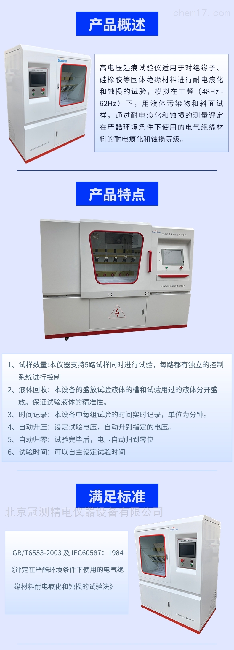 全自动高压漏电起痕试验仪-适用于对绝缘子、硅橡胶等固体绝缘材料进行耐电痕化和蚀损的试验,模拟在工频(48Hz - 62Hz)下,用液体污染物和斜面试样,通过耐电痕化和蚀损的测量评定在严酷环境条件下使用的电气绝缘材料的耐电痕化和蚀损等级。