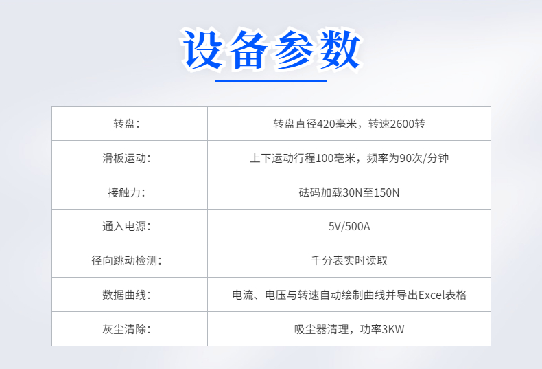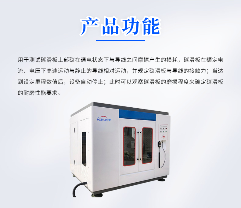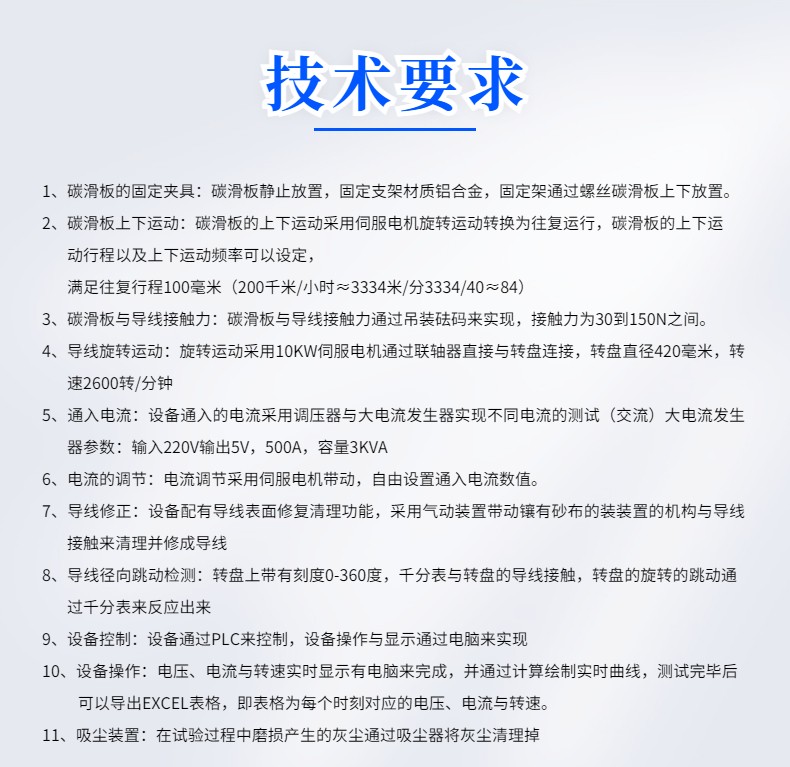 自动碳化板大电流摩擦磨损试验机设备用于测试碳滑板上部碳在通电状态下与导线之间摩擦产生的损耗,碳滑板在额定电流、电压下高速运动与静止的导线相对运动,并规定碳滑板与导线的接触力;当达到设定里程数值后,设备自动停止;此时可以观察碳滑板的磨损程度来确定碳滑板的耐磨性能要求。