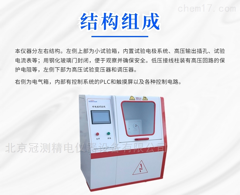 本仪器分左右结构。左侧上部为小试验箱,内置试验电极系统、高压输出插孔、试验电流表等;用钢化玻璃门封闭,便于观察并确保安全。低压接线柱装有高压回路的保护电阻等,左侧下部为高压试验变压器和调压器。